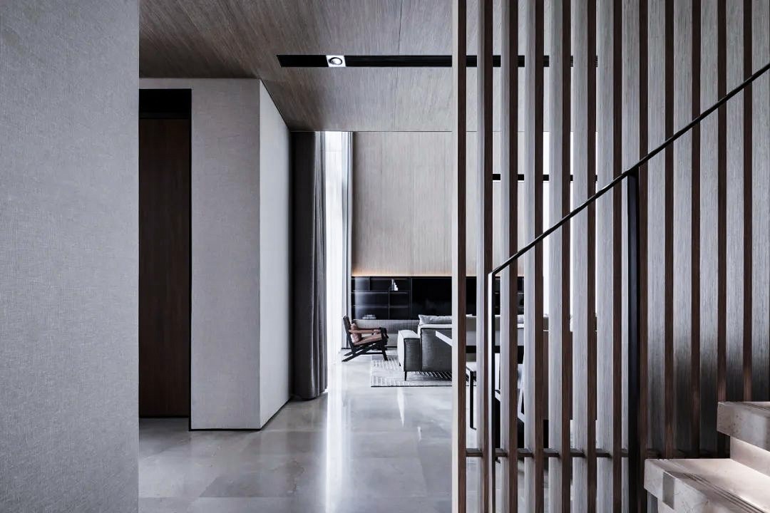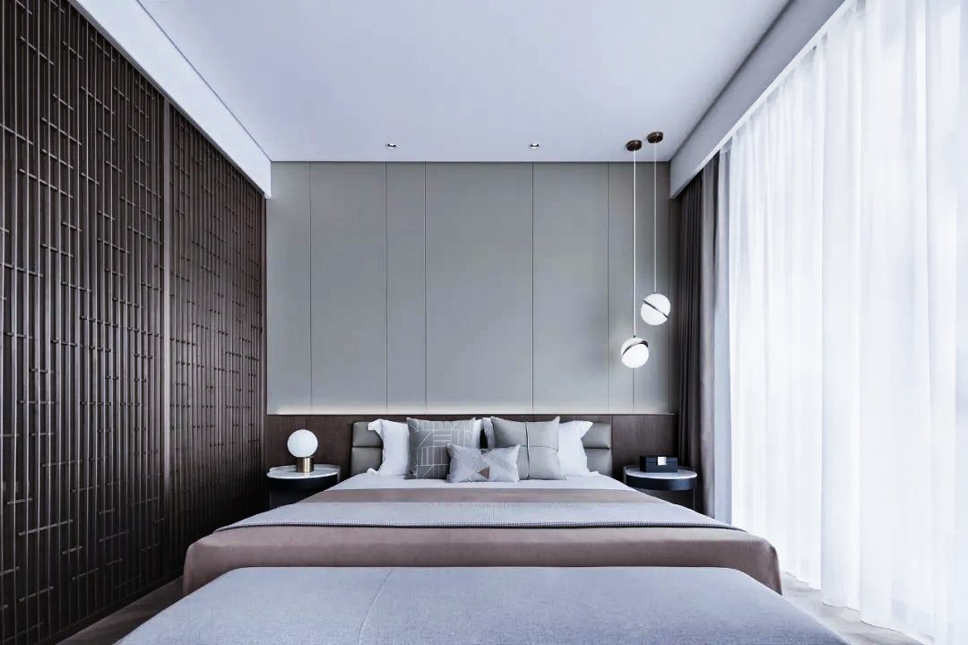 The master bedroom suite on the second floor is the perfect embodiment of a penetrating and interesting space design. The designer seeks inspiration from the layered mountains and created a well-proportioned design with the extension, interweaving and collision of large areas. The wooden grille sliding door exudes a unique kind of freedom and softness.