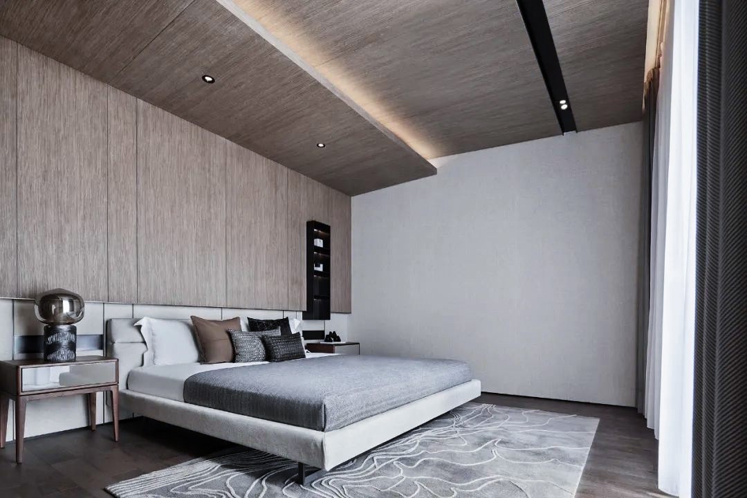 A large area of wooden panels add a touch of simplicity and warmth. The designer used the terrace to create a comfortable corner outside the bedroom, further enhancing the premium living quality and reflecting the thoughtful design of the bedroom.