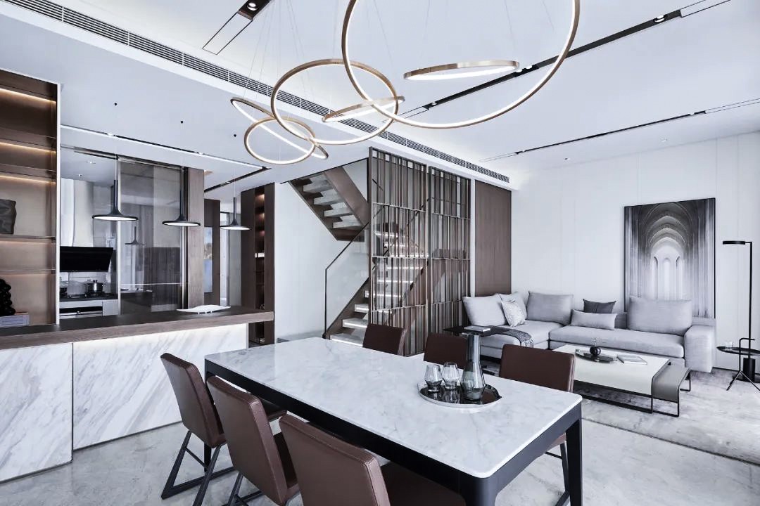 The lines in the stairway reveal both the connection and independence of different areas; and the ingenious suspended handrail is a perfect combination of function, aesthetics and technique. Every step you take, you can feel the beauty of flowing light and shadow.
