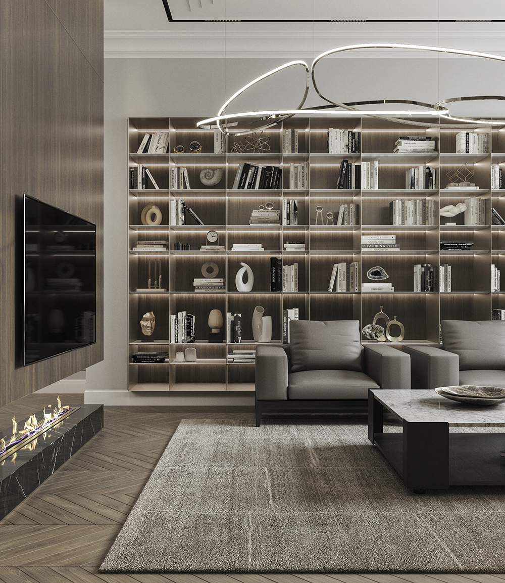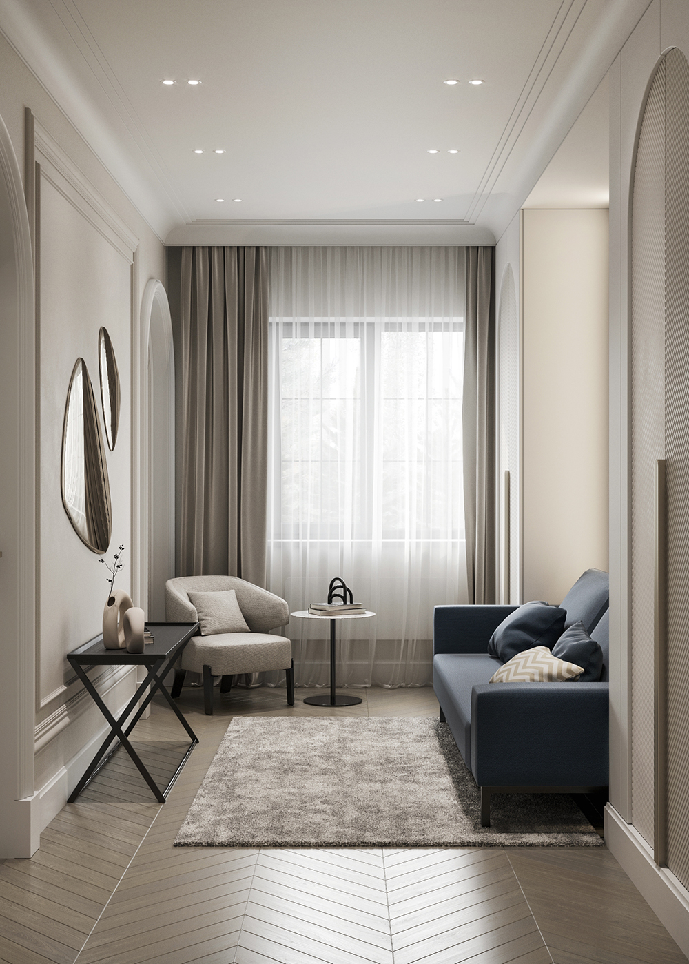The owner of this project hopes to create a cozy and modern space with classical elements. As a result, the designer of CAMERICH Kazakhstan store incorporates herringbone patterned floor, plaster moldings, arch and various classical elements into the overall modern design.