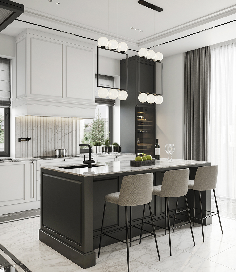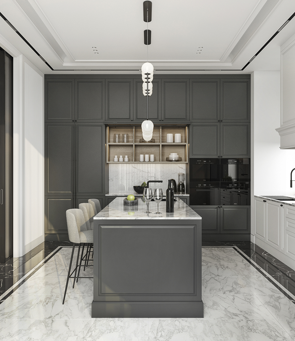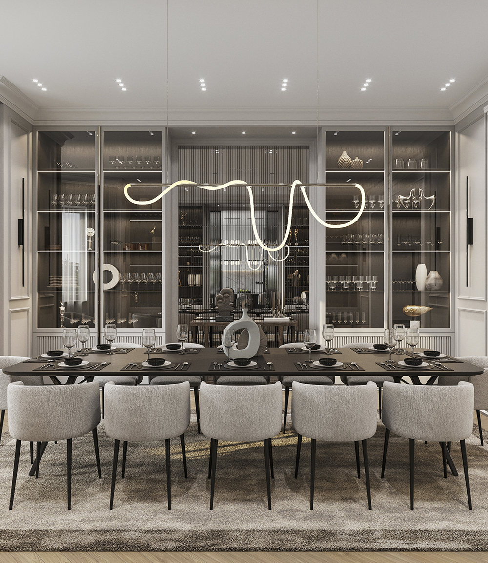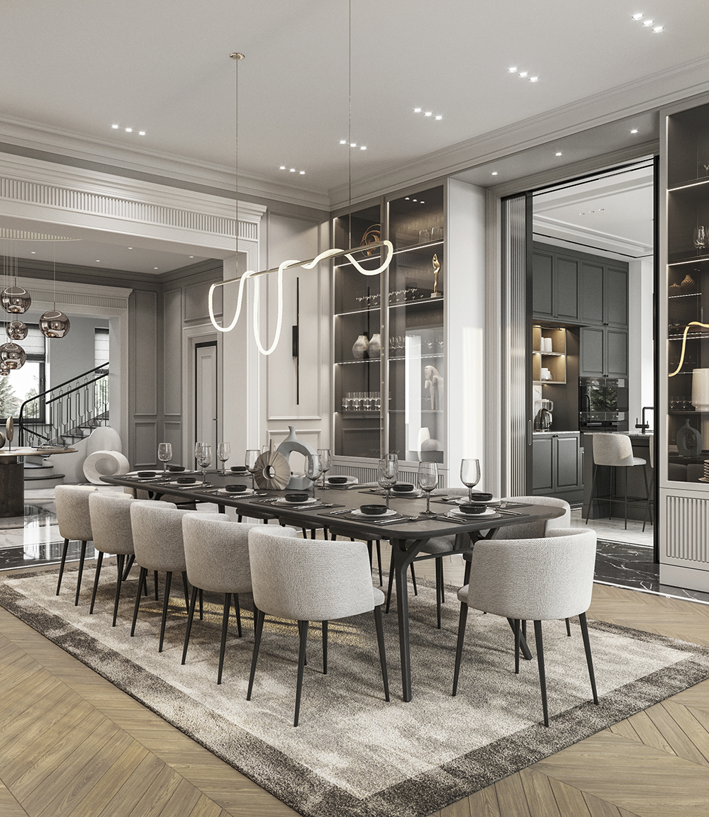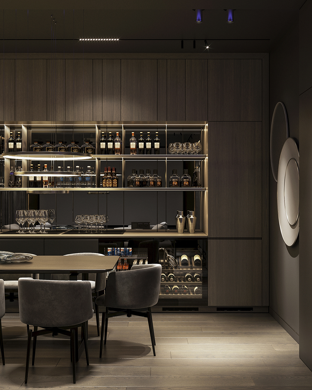 The dining space plays an important role in this traditional Kazakh family, where the hostess carefully prepares meals for family members every day. The spacious long table and the exquisite kitchen island are places where the family can spend time together.
