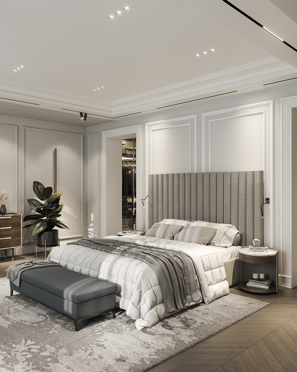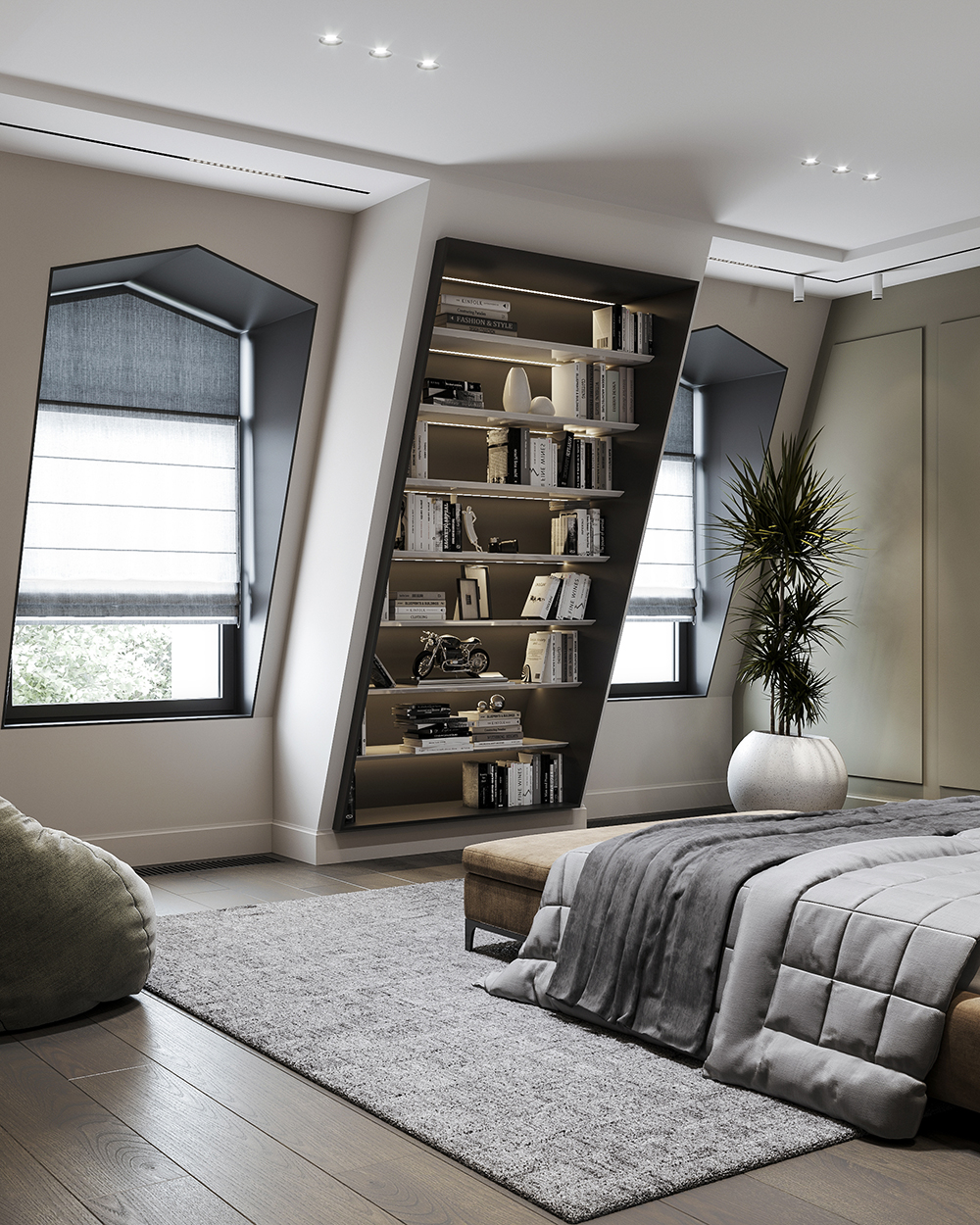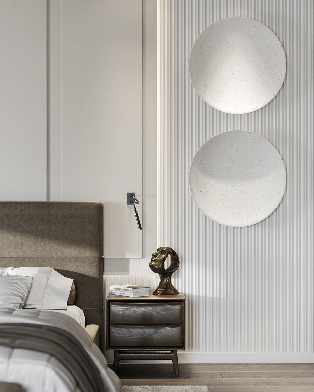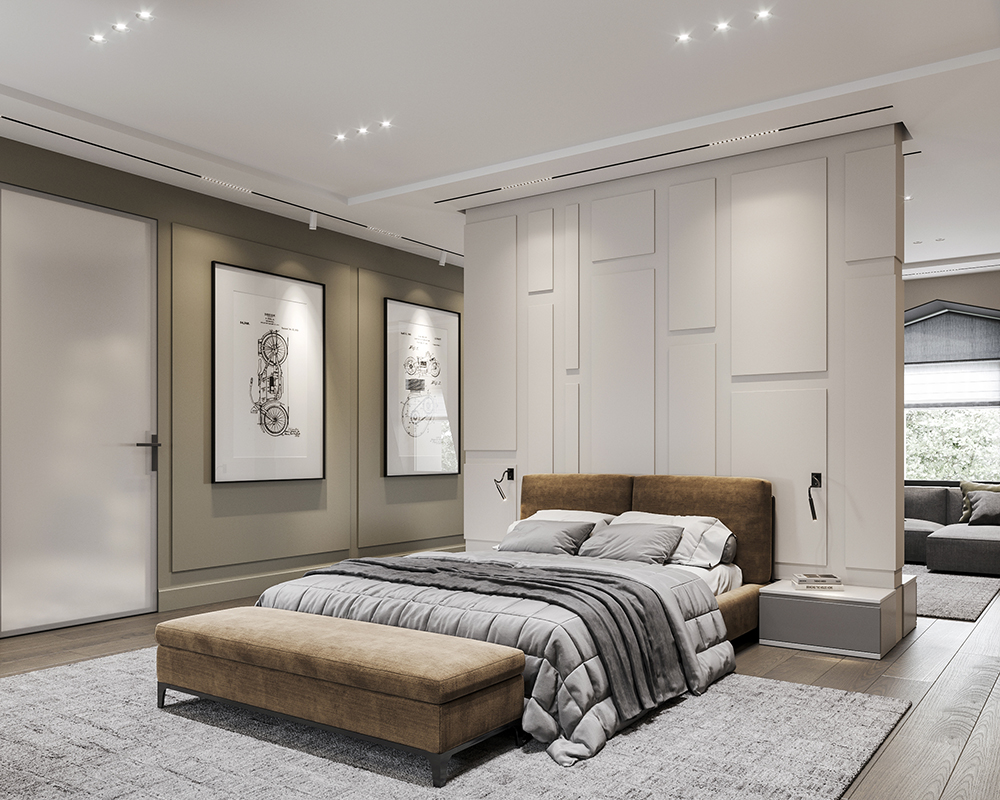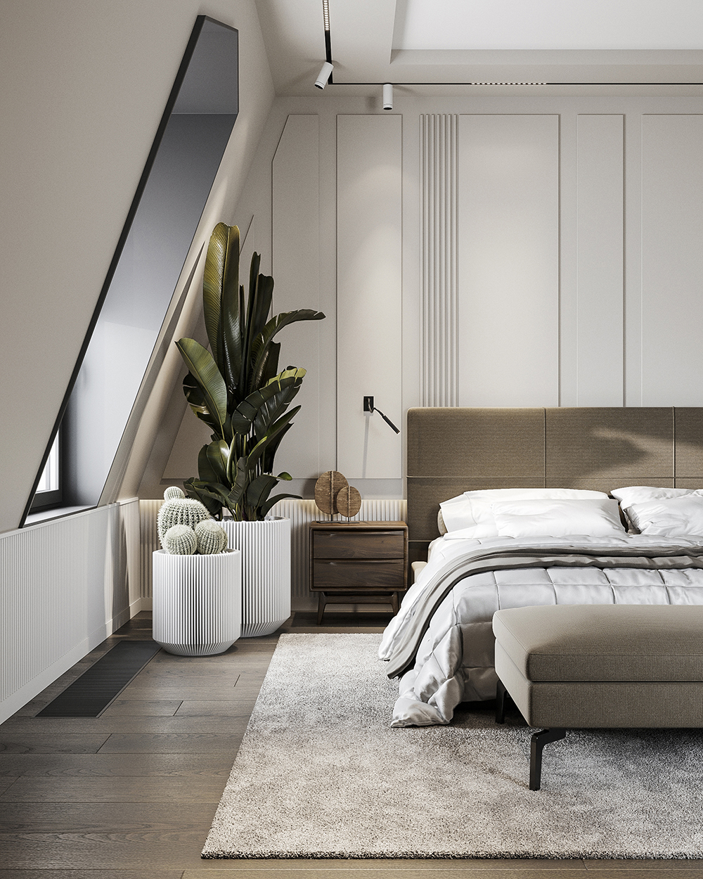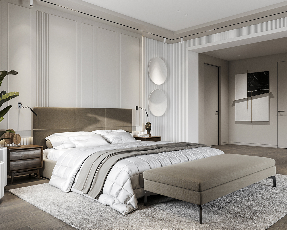 The bedrooms are of unique personalities in terms of color and functional design. The master bedroom has soft gray and brown tones, which add a calm and soothing feel to the space.