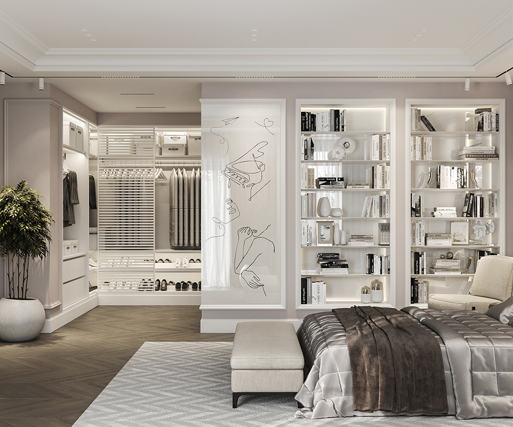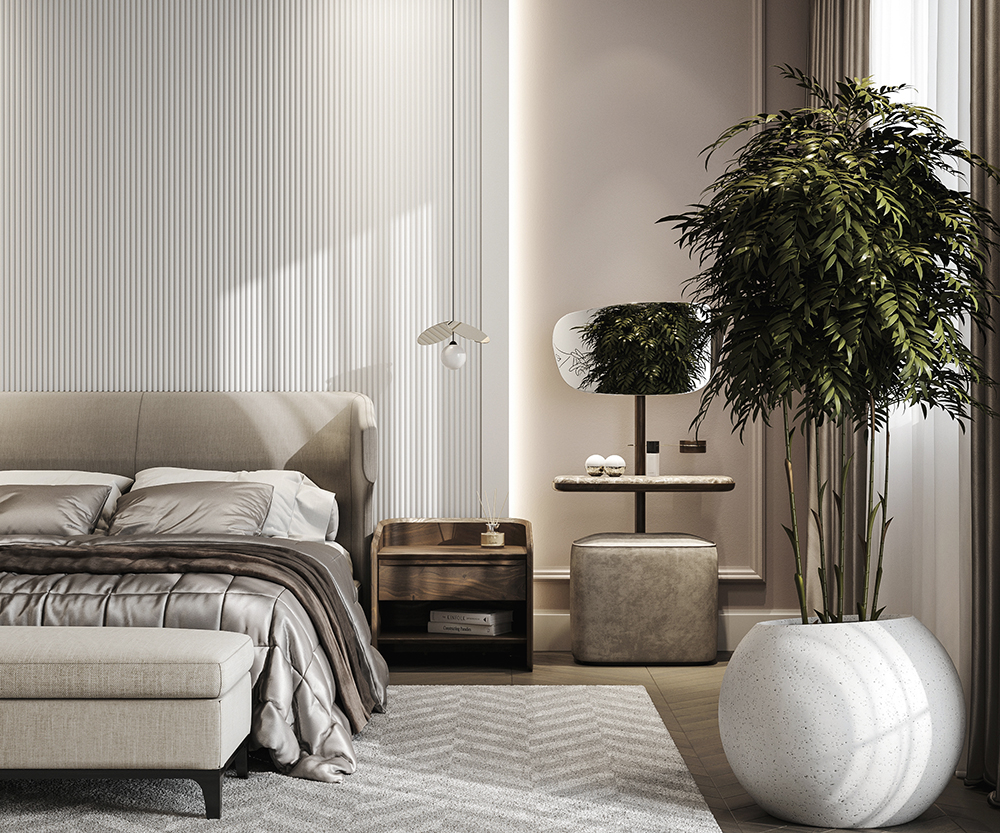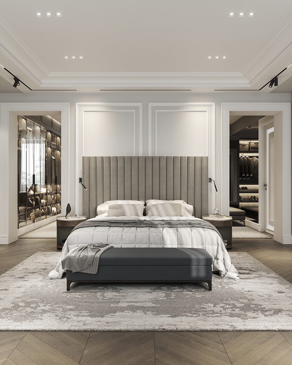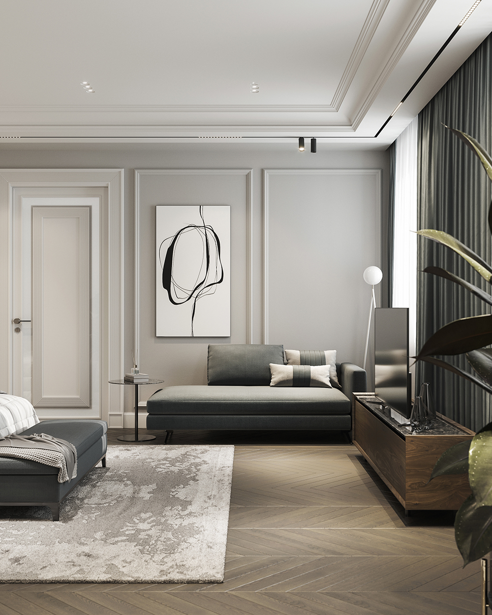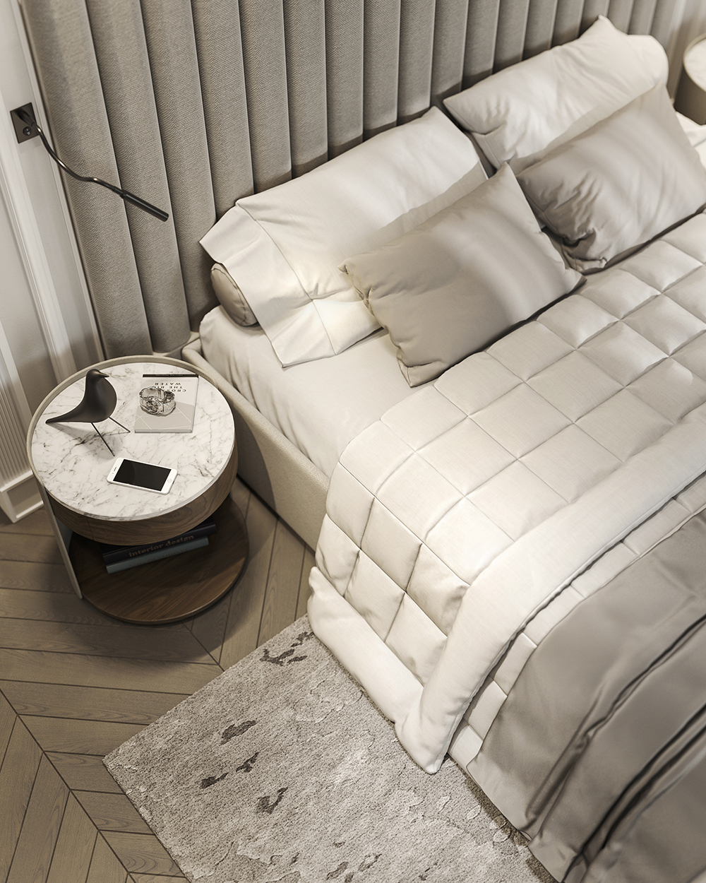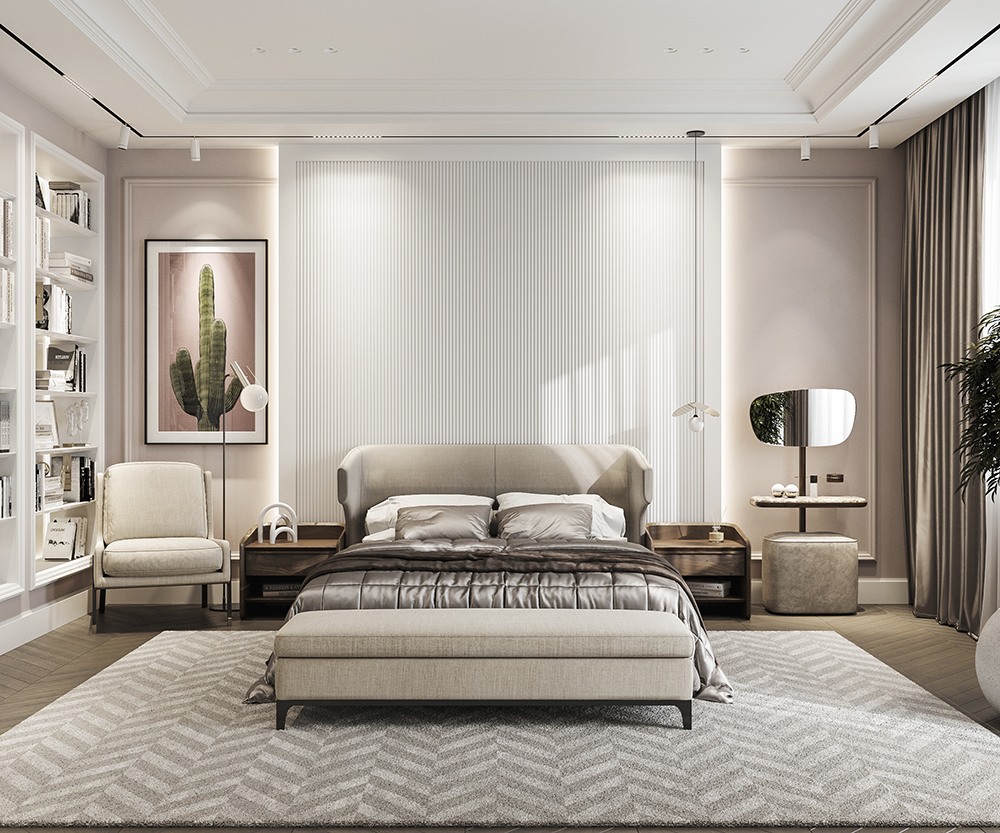 The bedrooms are of unique personalities in terms of color and functional design. The master bedroom has soft gray and brown tones, which add a calm and soothing feel to the space.