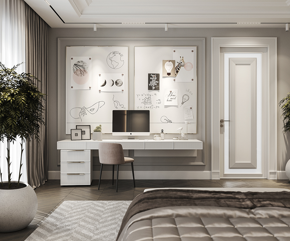 The girl's room is designed with beige, pink tones, and a glass graffiti wall, which tells an imaginative girl.
