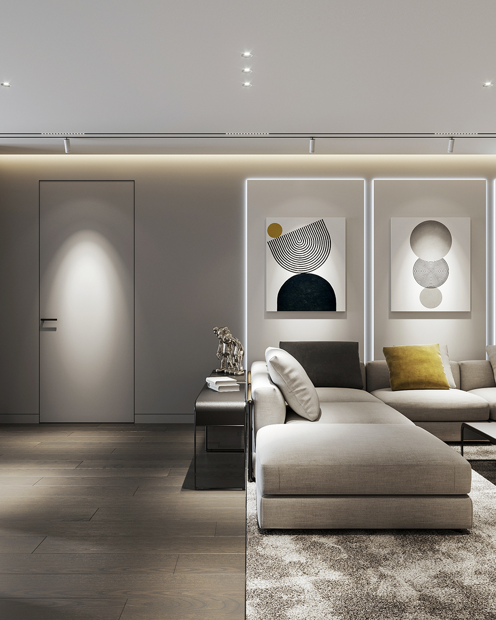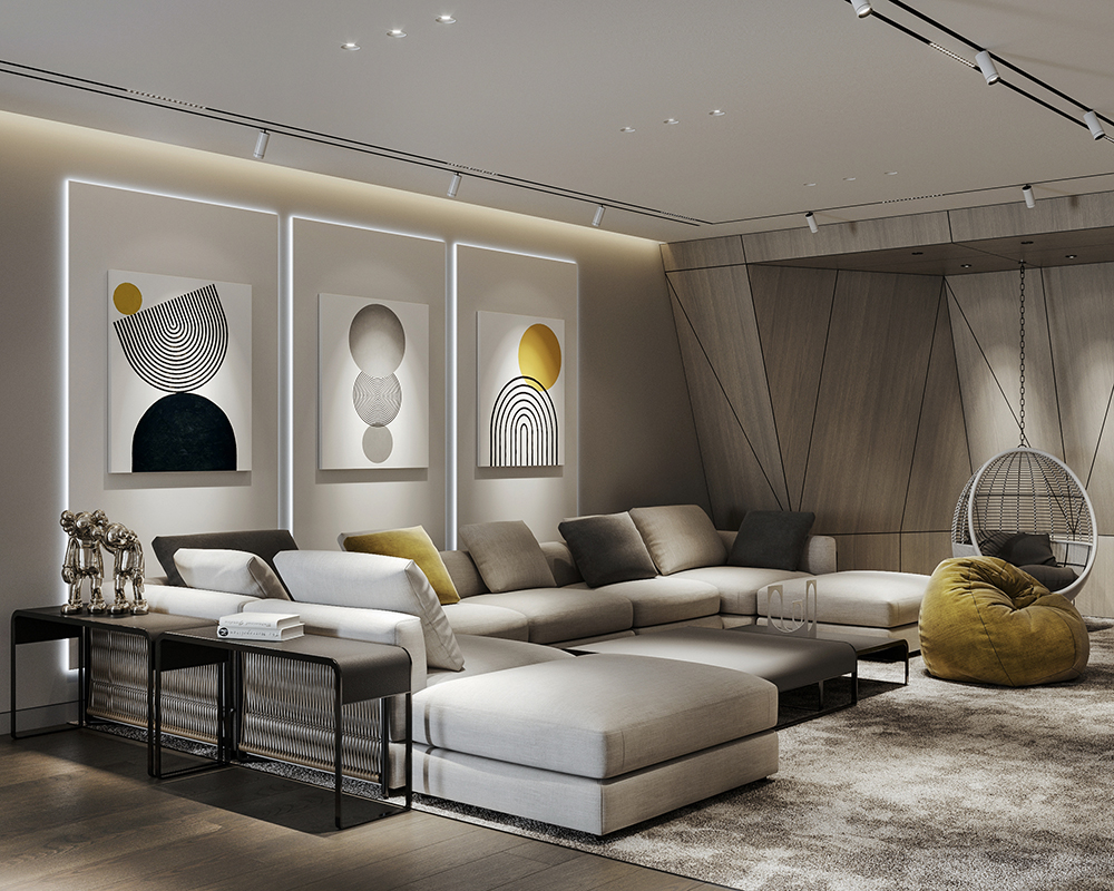 The long and narrow living room is divided into two zones of different sizes by a suspended partition wall with wooden finishes. The larger zone is suitable for leisure and entertainment, while the smaller one is more private and artistic. The two separated zones together create a warm and inviting home atmosphere.