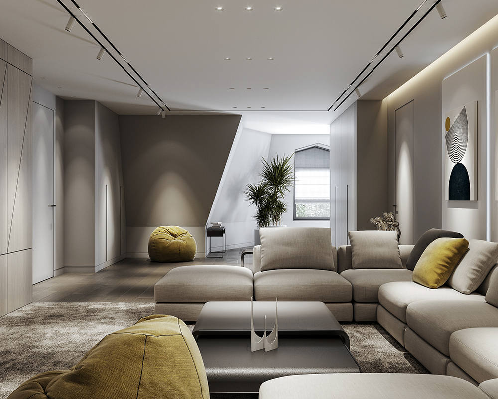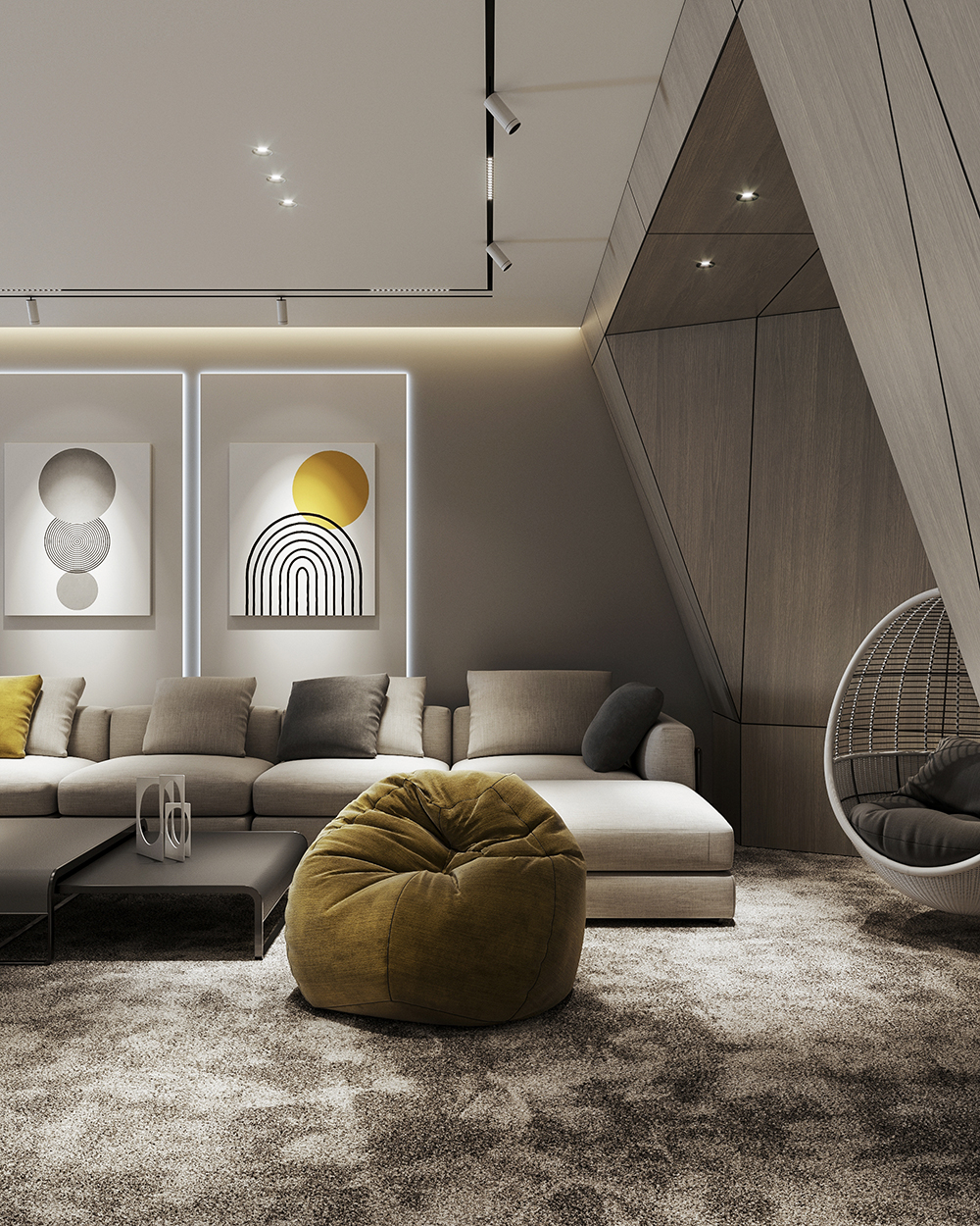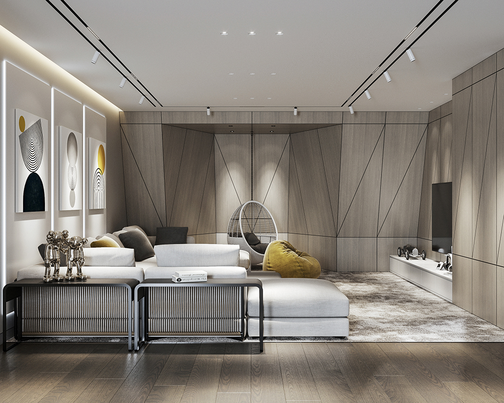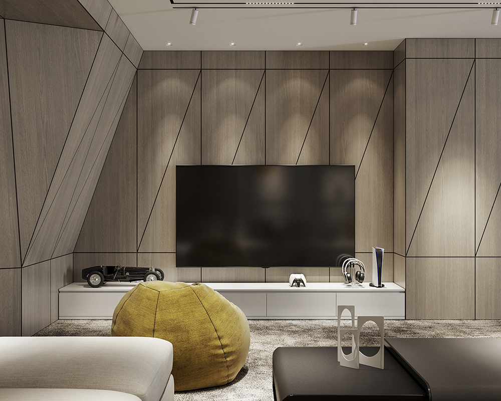 On the top floor, geometric lines and special-shaped walls are combined to create an interesting game space. The family can sit or lie on the spacious and soft sofa while experiencing the excitement of games.