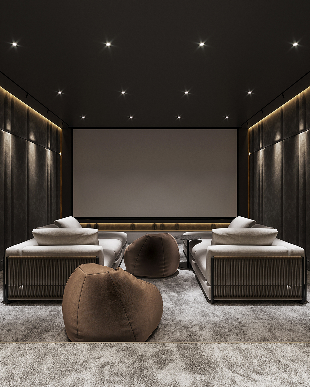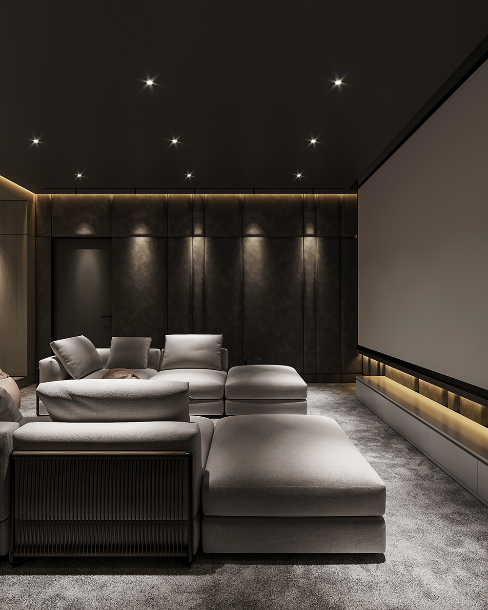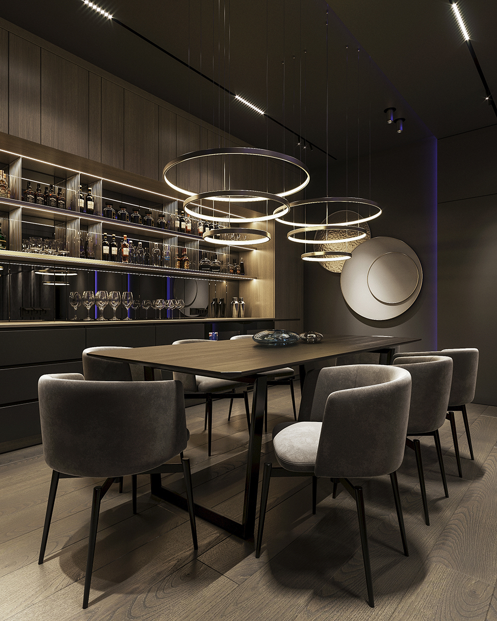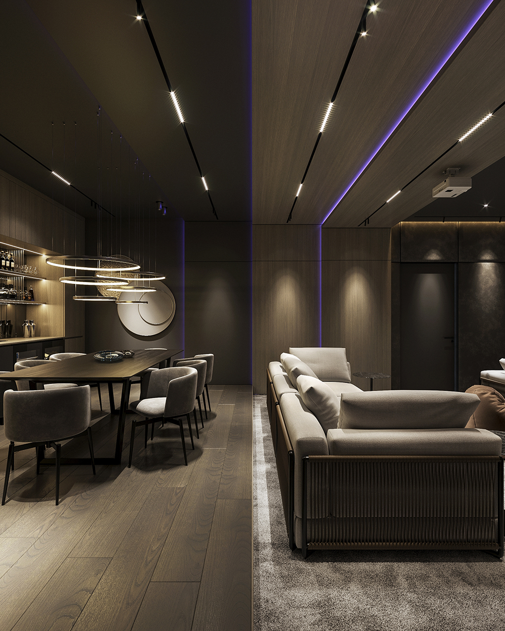 In the basement, the dark wood finishes make it a perfect home cinema and a bar. Taking a favorite spot to watch a movie, or having a drink with family at the table, one could enjoy every minute of life.