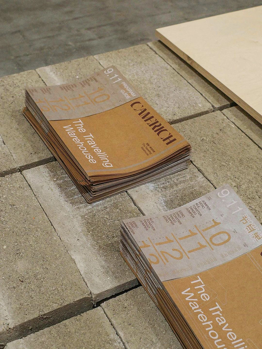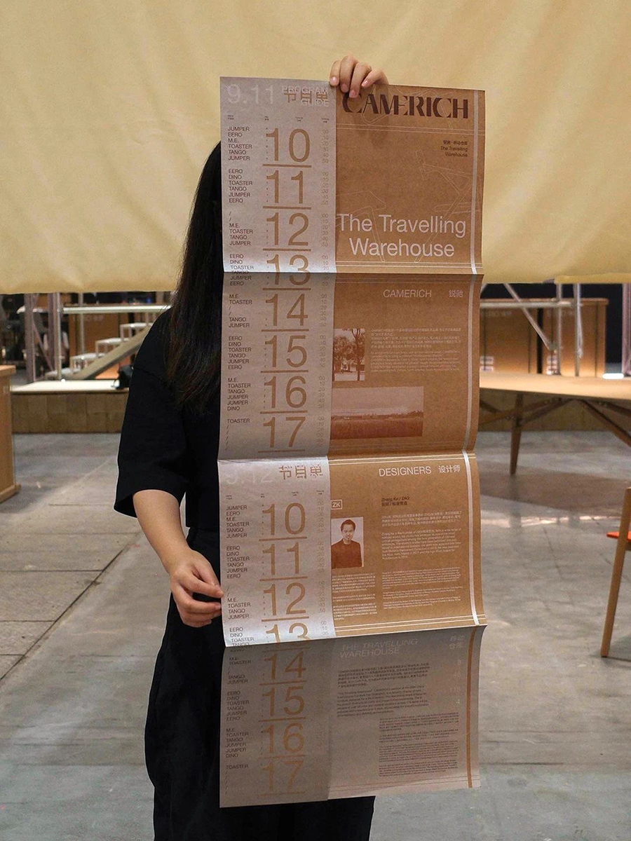 The program guide of “the Travelling Warehouse” continues the same size of the newspaper at “the Temporary Storage Garden” in 2023. The unboxing timeline is printed on the one-meter-long folded paper. The kraft paper and silver ink, echoing with the boxes and shelves, deliver the sustainability concept it embodies.
