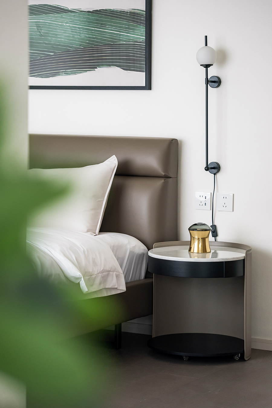 The design of the secondary bedroom emphasizes serenity and comfort, with a stress on the space's elegance and texture. This allows residents to take a quiet break from the hustle and bustle.