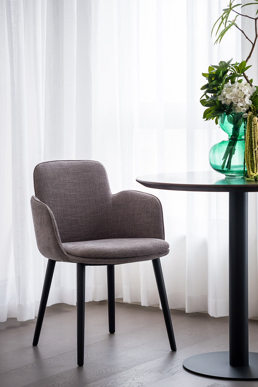 This space serves not only as a place for rest but also includes a functional area for work and study. The thoughtfully designed layout features a simple yet practical office area positioned conveniently next to the window. Complete with the elegant WITTY desk and BALLET chair, it creates a perfect nook for temporary work or study.