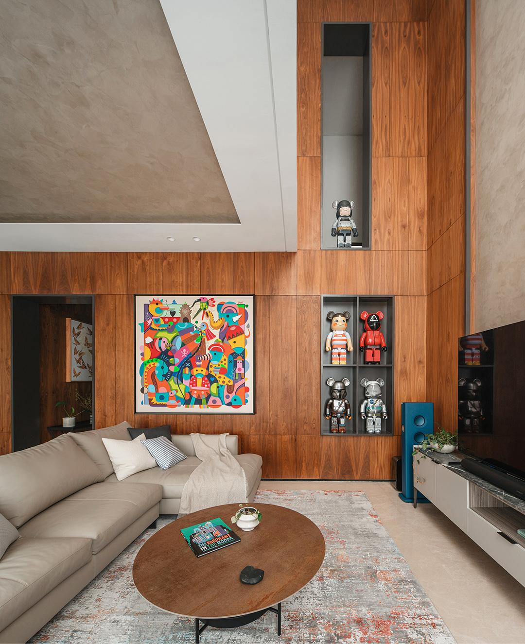 With such imaginative design, mild and moderate furniture is needed for balance. CAMERICH furniture is elegantly arranged throughout the space: the soft EASYTIME sofa, the gentle VAST chair, the clean-lined MATRIX cabinet, the comfortable MELODY bed, and the streamlined ECHO chair... Their quiet inclusiveness harmoniously coexists with the traditional South Asian wood elements, trendy dolls, and paintings of varied styles, forming a magical yet stable fusion.