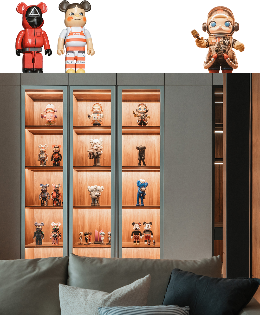 However, when your eyes sweep across the living room walls, you'll instantly fall into a world of pop toys! The entire walls are filled with dolls of various shapes and sizes, full of imagination. From Bearbrick to KAWS and BTS dolls, and even POP MART's MEGA SPACE MOLLY 100% series..., they're like elves from the pop culture universe, injecting mysterious vitality into this tranquil space.
