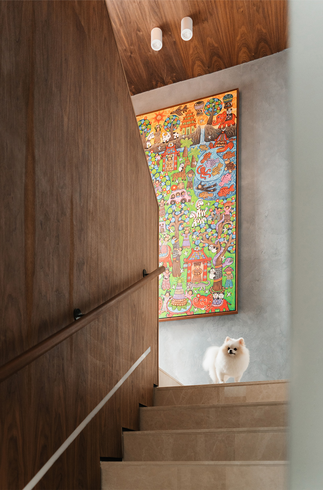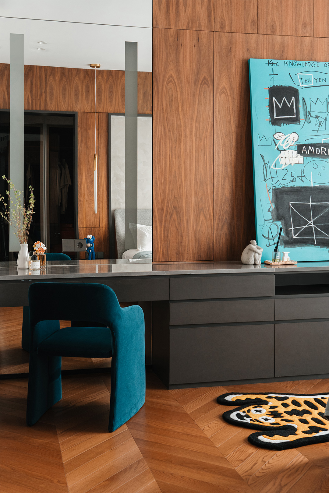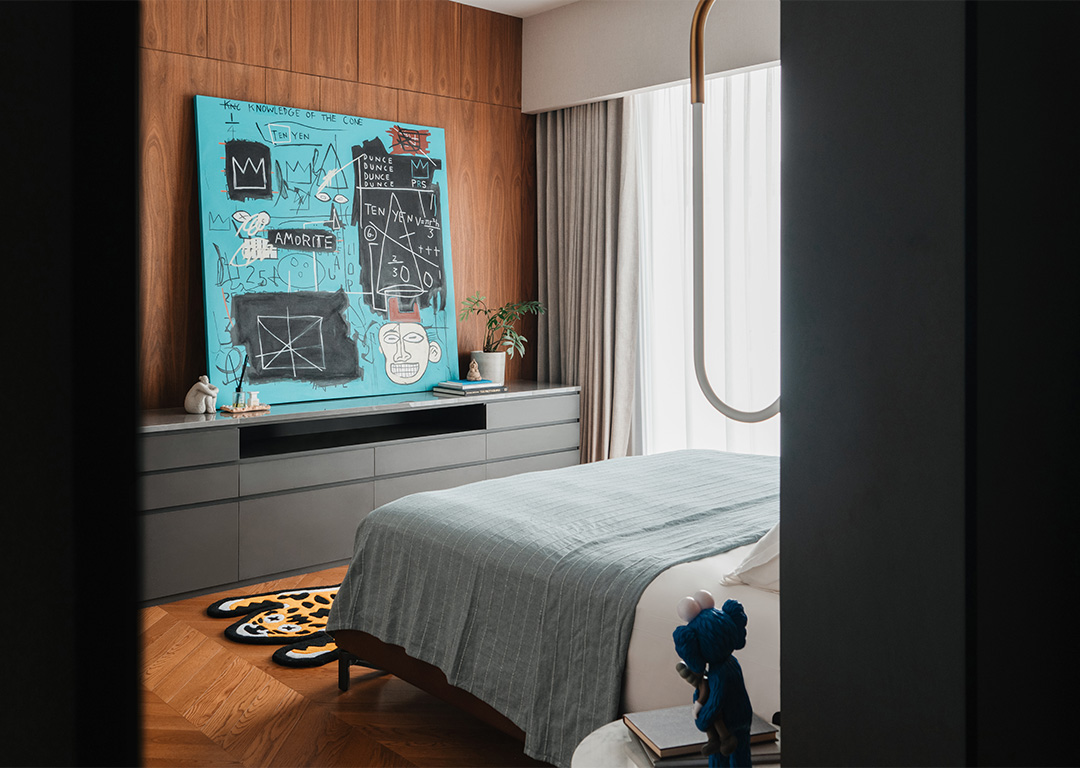 Apart from the dolls, the walls of each room are also adorned with colorful modern paintings. The living room features a playful cartoon painting, while the staircase and dining room showcase digital oil paintings with distinct Indonesian folkloric characteristics. In the bedroom, atop the cabinet sits Equals Pi, an artwork created by the late French graffiti artist Jean-Michel Basquiat in 1982, on which the graffiti elements against a Tiffany blue background add a touch of unrestrained flair and excitement to the serene space.