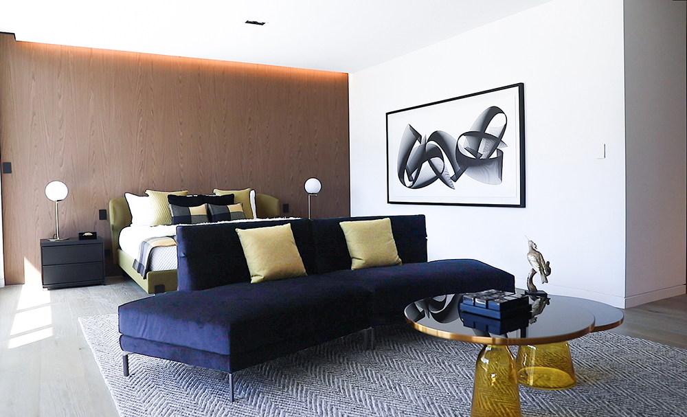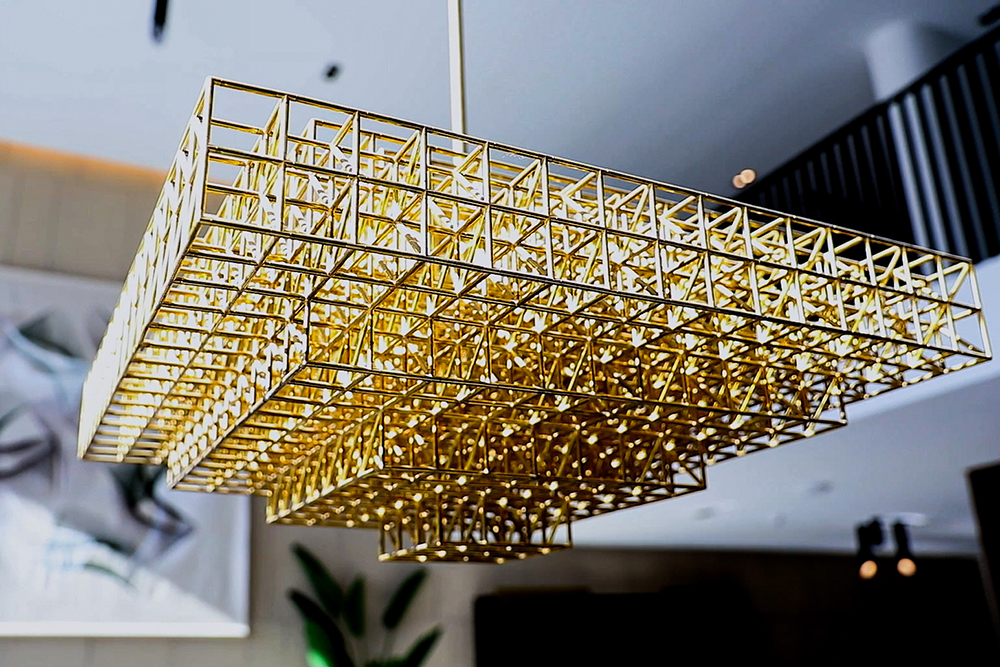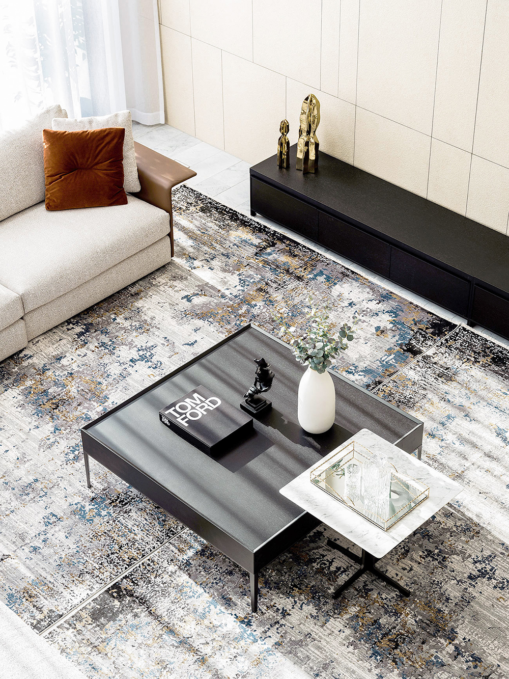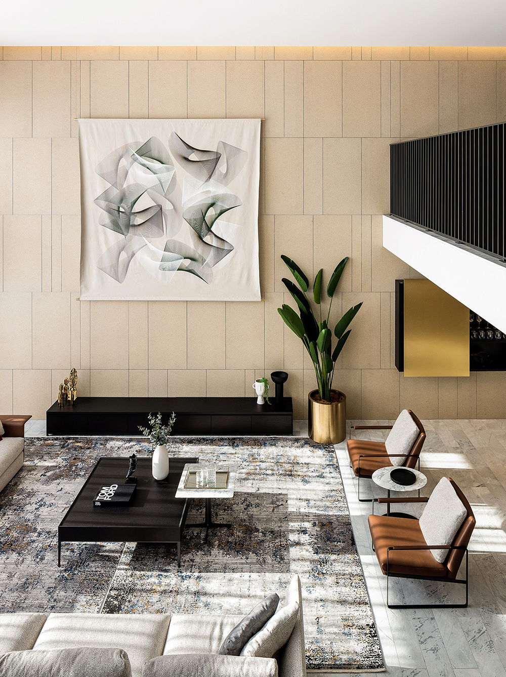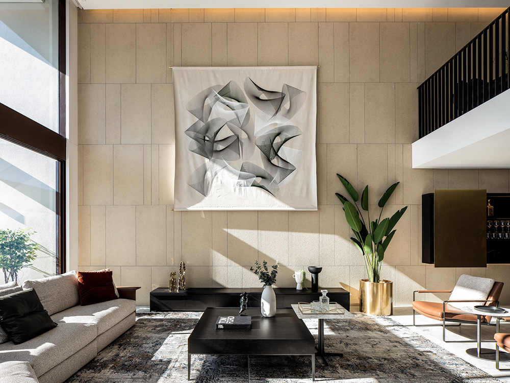 而来自CAMERICH(锐驰)的家具温润大方,平衡了金属材料带来的酷劲,让空间更具舒适性与现代感。客厅中央一组巨大的L形组合开云足球(中国)官方网站与墙面的巨幅抽象画遥相呼应,奠定简洁大气的装饰基调。餐桌上方的黄铜纵横吊灯营造出一种现代工业感氛围。定制切割的ELBA大理石地板传递出高贵优雅的质感。